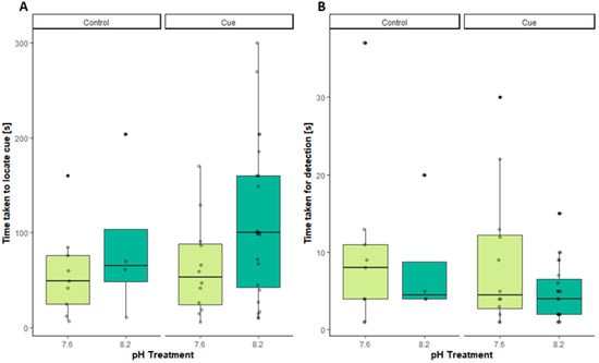 Kim et al. [] found individual variation in the speed of antennule flicking and speed of prey detection, with crabs exposed to low pH treatments displaying higher individual variation than in the control pH treatment, suggesting that phenotypic diversity could promote adaptation to future ocean acidification. We similarly recorded a wider range of initial reaction times across the individuals tested in low pH treatments, ranging from 1– 70 s, supporting the suggestion that individual variation may relate to phenotypic diversity as a sign of adaptation to future ocean pH conditions. Individual variation in our study may have also been caused by additional factors such as social hierarchies (winner/loser effects, size), which can influence behavioural responses towards the cues [,].
