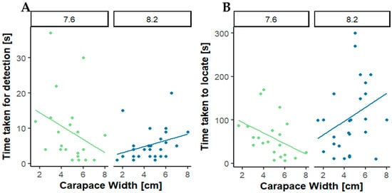 The responses of male crabs towards the pheromone are longer in normal pH and close to being significant (p-value = 0.08844, Figure 2A), and the variance in Figure 2A is greater at pH 8.2 than in reduced pH conditions. As experiments were undertaken towards the end of the reproductive season when not all male crabs respond to sex pheromones and larger, dominant males are more likely to respond to the female sex pheromone. We also analysed the data for a correlation of male size and the impacts of pH levels. Figure 3A,B shows marked size-dependent trends, both in the time taken to initiate antennal flicking and the time to locate a cue. While larger individuals under normal pH conditions take longer to detect and to locate the cue, this trend is reversed under low pH conditions.