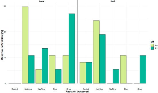 Percentages of visual responses of different behaviours exhibited by large and small males. Crabs exposed to female sex pheromone in a Y-shaped olfactometer at current and future ocean pH levels. N = 74.