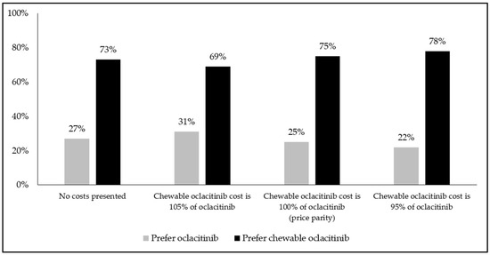 Two types of choice questions were included. One type of question asked whether pet owners would be willing to pay an additional cost to use chewable oclacitinib rather than oclacitinib. From this question type, differences in preference between oclacitinib and chewable oclacitinib treatment profiles were later examined using chi-squared analysis. The second question type asked whether pet owners would prefer oclacitinib or chewable oclacitinib, either in the absence of any associated cost or in a scenario where chewable oclacitinib was 5% cheaper, equivalently priced, or 5% more expensive than oclacitinib. From this question type, regression analyses were conducted to examine the influence of subgroup characteristics on the likelihood of being willing to pay an additional cost to use chewable oclacitinib rather than oclacitinib.