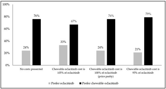 This study demonstrated that chewable oclacitinib was favoured by pet owners in comparison to oclacitinib for treating canine pruritis, with up to 42% of the respondents willing to pay more for chewable oclacitinib. Therefore, veterinarians may be able to offer chewable and/or palatable treatment options where available, with potential subsequent positive impacts on convenience, compliance, outcomes, quality of life, and subsequently the human–animal bond. Future research in this area could establish whether prior experience with administering chewable and/or flavoured canine medications influences the level of preference that is stated for alternative formulations.