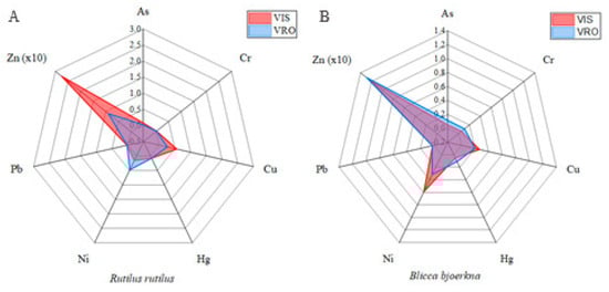 The concentration of nine metals and trace elements in the muscle tissue of roach and white bream was measured. The average concentrations of the analyzed metals and trace elements (As, Cd, Co, Cr, Cu, Hg, Ni, Pb, and Zn) are shown in Table 1 and Figure 2 (radar plots). In the total of 32 fish samples, the highest values were generally measured for Zn, while Cd and Co were below detectable levels. It should be borne in mind that although the concentrations of Cd and Co have been below the detection limit in muscle compared to the measured concentrations of other elements, these metals are toxic in very low concentrations in the tissue itself; so, their effects cannot be ruled out. Comparable consequences have been reported by many researchers in studies for different fish species [,,]. The detected As, Cu, Hg, Pb and Zn concentrations were below the maximum allowable concentrations set by the EU [] and the Republic of Serbia []. In roach, the bioaccumulation of As, Pb and Zn differed significantly (p < 0.05) between localities. The muscle had higher levels of As (p < 0.05), Cr, Cu, Hg, Pb (p < 0.05), and Zn (p < 0.05), except for Ni in roach from VIS compared to that from the VRO locality. The opposite trend was observed for the levels of As, Cr, Hg, Pb, and Zn, but there were no significant differences between the levels of all elements measured in white bream muscle at the two sites (Table 1, Figure 2).