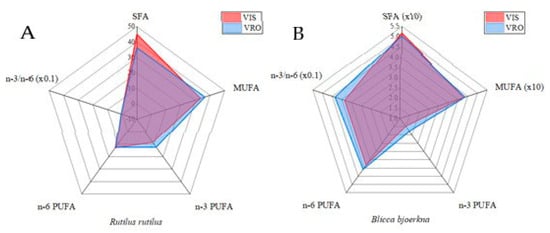 Radar plots presenting concentration of fatty acids in roach (A) and white bream (B) at the VRO and VIS localities.