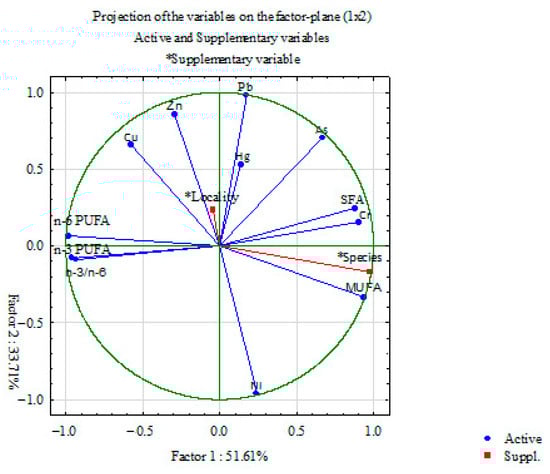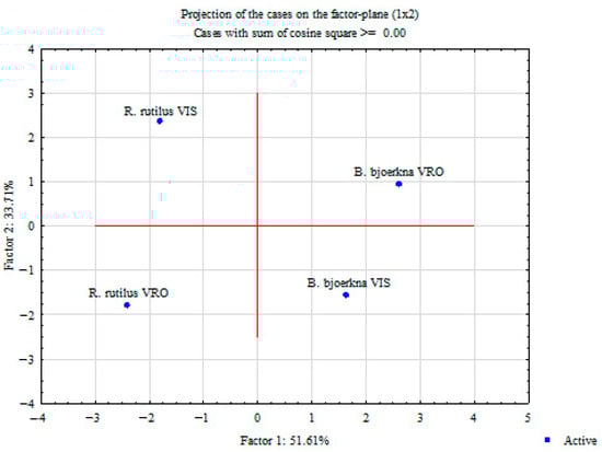 Principal component analysis was used to determine a possible separation of the two groups of fish studied based on all the parameters examined. PCA was performed in two ways: by projecting the relative contribution of each studied parameter into the factor plane (Figure 4) and by projecting the species and localities based on the studied parameters (Figure 5). PCA, which refers to the relative contribution of each parameter studied, showed that PC1 and PC2 can explain about 85.32% of the total variance in the data matrix. PC1 explained 51.61% of the total variance, with n-6 PUFA, n-3 PUFA and MUFA being the parameters contributing the most to the differences (Table 3). PC2 explains 33.71% of the total variance, with Pb, Ni and Zn being the parameters contributing most to the differences (Table 3). Summarizing the results of PCA for both species and localities, considering the parameters studied, PC1 and PC2 can explain 85.32% of the total variance. PC1 (51.61%) clearly distinguishes the studied species (roach on the left side of the y-axis and white bream on the right side). PC2 (33.71%) clearly distinguishes between VRO and VIS, and thus we cannot conclude that the localities have an influence on the investigated parameters.