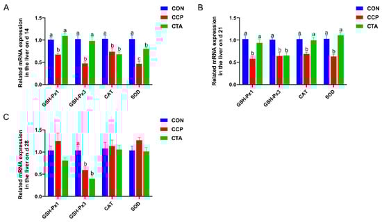 Antioxidant enzymes mRNA expression in the liver ((A) on day 14, (B) on day 21, (C) on day 28). Numbers are expressed as mean and SD, n = 14. a,b,c Values not sharing a superscript in the same row are markedly different.
