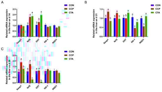 As presented in Figure 3, on day 14, the Nrf2 mRNA level was lower in the CON in the liver than in the CTA and CCP groups, and the GST mRNA level was markedly higher in CTA than in CON and CCP (Figure 3A, p < 0.05). On day 21, the CCP significantly increased the Keap1 and Nrf2 mRNA levels and significantly reduced the mRNA levels of HO-1 and NQO1 compared to the CON; compared to the CCP, the CTA markedly reduced the mRNA levels of Keap1 and Nrf2 and significantly increased the mRNA levels of GST and NQO1(Figure 3B, p < 0.05). On day 28, the CCP significantly enhanced the mRNA levels of Keap1 and Nrf2 compared to the CON; the CTA markedly decreased the mRNA levels of Keap1, Nrf2, and GST compared to the CCP (Figure 3C, p < 0.05).