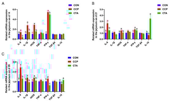 The cytokines mRNA expression in the jejunum ((A) on day 14, (B) on day 21, (C) on day 28). Numbers are expressed as mean and SD, n = 14. a,b,c Values not sharing a superscript in the same row are markedly different.