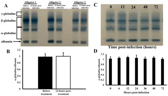 Effects of Infection on Serum Protein Profiles—Co-injection of alligators in the coelomic cavity with four different types of bacteria resulted in no changes in serum protein electrophoretic profile (Figure 1). The serum profiles for several different animals exhibited no changes in any of the main serum protein groups (Figure 1A) before and after infection as densitometric analyses showed similar quantification, as percent of total serum protein, of the major protein groups (Figure 1B). The α-globulins constituted 1.7 ± 0.3% of all total serum proteins in untreated animals, and 1.7 ± 0.5% after infection (p = 0.92). Likewise, the β-globulins were 28.8 ± 6.4% of total serum protein before treatment and 23.0 ± 6.3% after infection (p = 0.88). The expression of γ-globulins was also not affected by injection with bacteria before (59.8 ± 9.7%) and after infection (61.1 ± 9.8%, p = 0.87). In addition, the globulin/albumin ratios of 0.174 ± 0.043 and 0.168 ± 0.043 were also statistically indistinguishable (p = 0.89) for these samples. The serum protein profiles remained constant for 72 h after infection (Figure 1D), as the globulin/albumin ratios did not change at any time point (p > 0.05).