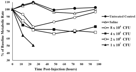 With the 1 × 107 CFU treatment group removed, ANOVA test results showed that animals treated with sterile saline were not statistically different from untreated controls at any time point after time 0 (p12 h = 1.00, p24 h = 1.00, p48 h = 1.00, p72 h = 0.997, p96 h = 1.00). In addition, injection of alligators with the lowest bacterial titer (8 × 104) resulted in metabolic rates that were not different from baseline levels at any time point (p > 0.05, Figure 2). However, injection of alligators with higher levels of bacteria (4 × 105 CFU) caused a decrease in metabolic rate of 27.4% (p = 0.045) below baseline at 48 h, which stayed 30.8% (p = 0.07) and 23.7% (p = 0.04) below baseline at 72 and 96 h post-injection, respectively. Likewise, the metabolic rate for alligators injected with 2 × 106 CFU exhibited metabolic rates 33.4% (0.013), 29.2% (p = 0.011), and 31.5% (p < 0.01) below baseline levels at 48, 72, and 96 h post-injection, respectively. Injection of alligators with the highest titer of bacteria (1 × 107 CFU) resulted in a decrease of 35.7% (p < 0.01) and 49.4% (p < 0.01) at 12 and 24 h post-injection, respectively. Two of the alligators died between 24 and 36 h, and the third alligator in this group died between 36 and 48 h, which prevented further collection of data for this group.