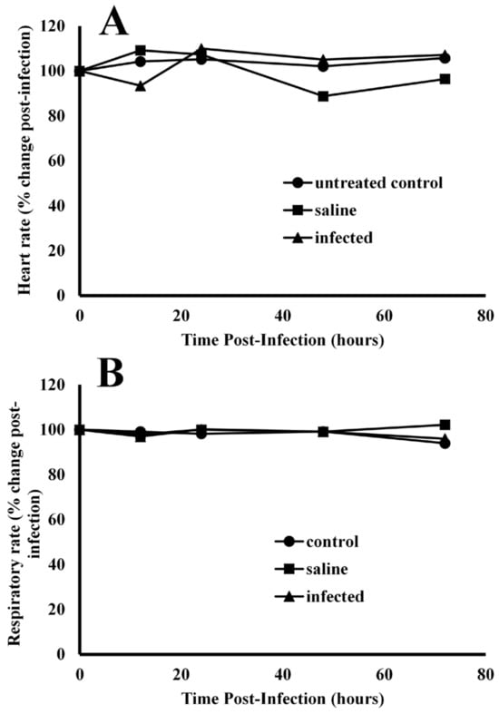 To determine if the cause of the decreased metabolic rate after infection was due to a bradycardia effect, we measured heartbeat rates in alligators before and after infection Figure 3A). The resting heart rate of all alligators before treatment was 50.3 ± 6.6 bpm (range = 40–60 bpm), which is much higher than other reports of 26–43 bpm [61], 25–30 bpm [62], and 40 bpm [63] for juvenile American alligators. However, temperature is strongly associated with heart rate, and the alligators in the present study were maintained at 30 °C, while in all other studies alligators were maintained at ambient laboratory temperatures. We were again surprised to find that the decrease in metabolic rate was not associated with an decrease in heart rate. Instead, the heart rate remained constant for at least four days after infection (Figure 3A). In an attempt to determine if bradypnea was associated with the decreased oxygen consumption after infection, we measured respiratory rates in infected and uninfected animals (Figure 3B). Similarly, the respiratory rate at ambient temperature (30 °C) was 2.73 ± 0.51 breaths/min, which was similar to those measured by Coulson and Hernandez [64] at ambient temperature [64] (1.5–3.3 breaths/min, 23–25 °C) and Campos [65] (breaths/min, 32 °C). However, the respiratory rate also did not change after acute infection with bacteria (Figure 3B).