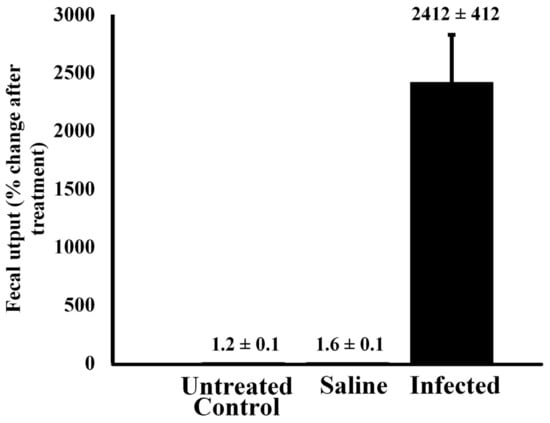 Effect of bacterial infection on fecal output—Injection of alligators with bacteria resulted in a large increase in fecal output within 6 h of injection (Figure 4). A Welch’s ANOVA was conducted to compare results in fecal output between untreated control alligators and those treated with sterile saline or infected with 105 CFU bacteria. The results indicated that there was a statistically significant change in fecal output from baseline between the three treatment groups, F(2, 4.044) = 14.1, p = 0.015. A Games–Howell post hoc test showed that there was no statistically significant difference in fecal output change between the control (M = 0.00614, SD = 0.007) and saline groups (M = 0.00246, SD = 0.0007), p = 0.605. However, the infected group showed significantly higher fecal output than the untreated control alligators (p = 0.022) and the saline-treated animals (p = 0.022).