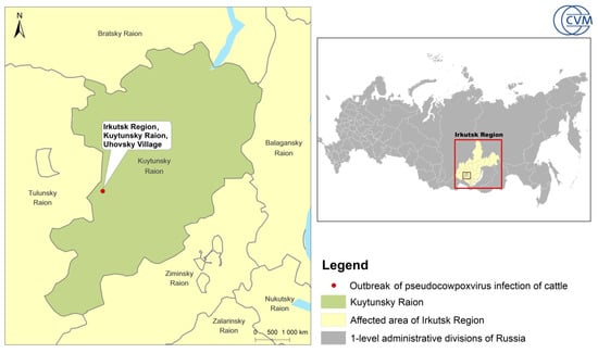 In September 2019, a total of 16 dairy cows (Holstein Friesian breed) on a farm in Ukhovsky village, Kuytun district, Irkutsk region (E 101.136976: N 54.403191) (Figure 1), developed skin lesions on their teats.