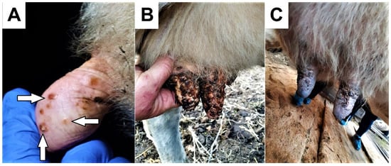 Lesions on the tits of a dairy cow at the age of 4 years: (A) The formation of macula (1st day) and papules (3rd day). (B) The formation of scabs (5th day). (C) The beginning of the regenerative process (8th day).