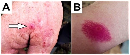 Damage to the skin of the milker’s hands who came into contact with animals during manual milking. (A) Macula (1st day). (B) Pustule formation (4th day).