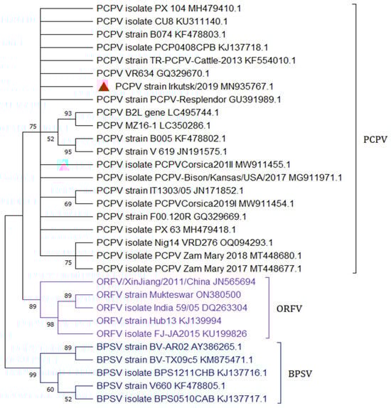Phylogenetic trees of parapoxviruses based on nucleotide B2L gene fragment sequences. The percentage bootstrap values calculated from 1000 replications are indicated above the internal nodes. This analysis involved 31 nucleotide sequences. The codon positions included were 1st + 2nd + 3rd + non-coding. Russian isolate Irkutsk/2019 is highlighted with a red triangle.
