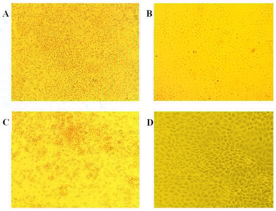 MDBK and bovine lung embryonic cells monolayers after inoculation of the viral material. (A) Bovine lung embryonic cell culture with 70% of CPE. (B) Control bovine lung embryonic cell culture. (C) MDBK cell culture with 50% of CPE. (D) MDBK control cell culture.