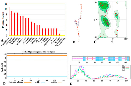 (A) The percentage values of amino acids in the flightin of V. basalis. (B) 3D structure of the flightin of the V. basalis and (C) Ramachandran. (D) Prediction of the transmembrane topological structure of flightin protein. (E) SOPMA-2D structure prediction. (Blue shows alpha helix, red shows extended strand, green shows beta-turn, and yellow shows random coil).