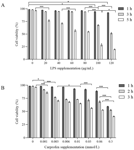 The effect of lipopolysaccharide (LPS) and Carprofen (CA) on the neutrophil viability. Neutrophil viability was assessed by measuring LDH enzyme activity. (A) Neutrophils were treated with LPS (0, 20, 40, 60, 80, 100 and 120 µg/mL) for 1, 3, and 5 h. (B) Neutrophils were treated with CA (0, 0.001, 0.003, 0.006, 0.01, 0.03, 0.06 and 0.3 mmol/L) for 1, 2 and 3 h. Experiments were performed three times and in triplicate per time. Each column represents the mean ± SEM. Statistical significance is indicated as follows: *** represents p < 0.001, * represents p < 0.05.