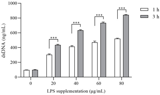 The supplementation of 20, 40, 60, and 80 μg/mL of LPS resulted in minor changes in ROS production when compared to the non-LPS group after 3 h of treatment (p > 0.2). Results about the quantitative assessment of double-stranded DNA produced by NETs are shown in Figure 3. The quantification of dsDNA was determined using the standard formula: dsDNA = (NETs Fluorescence value − 84.52)/50.679. The stimulation of PMNs with LPS dose-dependently increased following 1 or 3 h of incubation. LPS have little impact following a 1 h incubation but a significant effect on dsDNA level after 3 h (p < 0.0001).