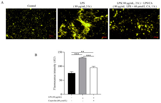 Representative fluorescence microscopy images of neutrophil extracellular traps (NETs) stained with SYTOX orange of neutrophils treated with lipopolysaccharide (LPS) and LPS + Carprofen (CA) for 3 h. Neutrophils were treated with LPS, and LPS + CA co-incubation for 3 h as described in the figure. The quantification of eight randomly selected images from each group was performed using ImageJ software. Figure (B) represents the results quantified from Figure (A). Each column represents the mean ± SEM. *** represents p < 0.001, ** represents p < 0.01.