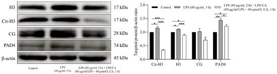 The effects of lipopolysaccharides (LPS) and LPS + Carprofen (CA) co-incubation for 3 h on neutrophil extracellular traps (NETs)-related protein expression. The expressions of proteins were assessed through western blotting and the results were quantified by ImageJ software. All data originate from three biological replicates. Each column represents the mean ± SEM.*** represents p < 0.001, ** represents p < 0.01, * represents p < 0.05.