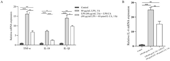 The effect of lipopolysaccharide (LPS) and LPS + Carprofen (CA) co-incubation for 3 h on the expression of pro-inflammatory cytokines (Tumor necrosis factor-α (TNF-α), interleukin-6 (IL-6), IL-18 and IL-1β) by neutrophils. Gene expression was assessed through the Real-time qPCR technique and all gene expressions were normalized to β-actin. All data originate from three biological replications. Figure (A) shows the mRNA expression levels of TNF-a, IL-18 and IL-1B, and Figure (B) shows the mRNA expression level of IL-6. Each column represents the mean ± SEM. *** represents p < 0.001, ** represents p < 0.01, * represents p < 0.05.