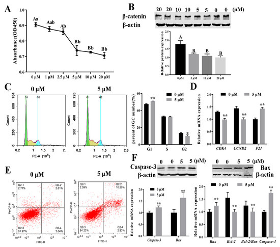 Effect of IWR-1 on the proliferation, cell cycle progression, and apoptosis of bovine follicular granulosa cells (GCs). (A) Effect of IWR-1 on cell proliferation; (B) effect of IWR-1 on β-catenin protein expression; (C) effect of IWR-1 on the percentage of cells at the G1, S, and G2 phases; (D) effect of IWR-1 on the expression of cell cycle genes (CDK4, CCND2, and P21) in GCs; (E) flow cytometric analysis of the effect of IWR-1 on the percentage of apoptotic cells (quadrants 2-2 and 2-4); (F) effect of IWR-1 on the expression of cell apoptosis genes (Bax, Bcl-2, and Caspase-3) and apoptosis proteins (Bax and Capase-3); * p < 0.05, ** p < 0.01. Different lowercase and uppercase letters indicate significant differences at p < 0.05 or p < 0.01, respectively.