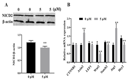 Effect of IWR-1 on the Wnt/β-catenin and Notch pathways in bovine follicular granulosa cells (GCs). (A) Effect of IWR-1 on NICD2 protein expression; (B) effect of IWR-1 on the expression of Wnt genes (CTNNB1, Axin2, LEF1, and Wnt2) and Notch genes (Notch2, Jag1, and Hey2). * p < 0.05, ** p < 0.01.