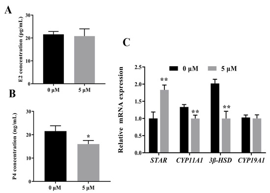 The effect of IWR-1 on the expression of steroidogenesis genes and hormone secretion by GCs was assessed by measuring the mRNA expression of steroidogenesis genes and E2 and P4 concentrations. IWR-1 decreased the concentration of P4, but not E2, in cell supernatants (Figure 3A,B) by downregulating CYP11A1 and 3β-HSD and upregulating STAR (Figure 3C). The intra-assay coefficient of variation (CV) for E2 and P4 was 4.09% and 8.70%, respectively, in the supernatant of GCs not treated with IWR-1, and 8.81% and 7.94%, respectively, in the supernatant of GCs transduced with 5 μM IWR-1.