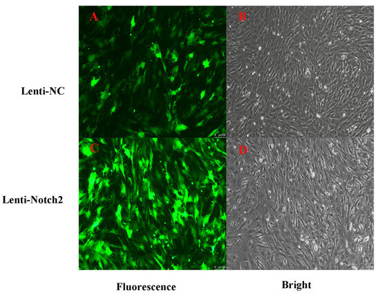 The GCs were transduced for 48 h with a lentivirus carrying Notch2 siRNA or NC siRNA and were imaged using fluorescence microscopy. The Notch2 siRNA and NC groups exhibited strong green fluorescence, indicating successful plasmid integration into the GCs (Figure 4).