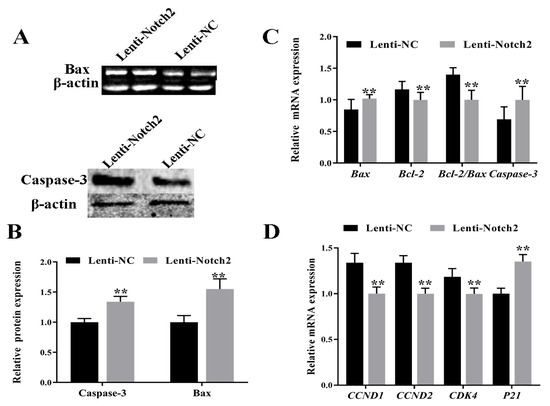 Notch2 silencing increased the apoptosis rate in GCs. Specifically, Notch2 silencing increased the protein (Figure 5A,B, Figure S4) and mRNA (Figure 5C) expression of Bax and Caspase-3 and decreased the expression of the anti-apoptotic gene Bcl-2 (Figure 5C). Furthermore, Notch2 silencing arrested the cell cycle by downregulating CCND1, CCND2, and CDK4 and upregulating p21 (Figure 5D).
