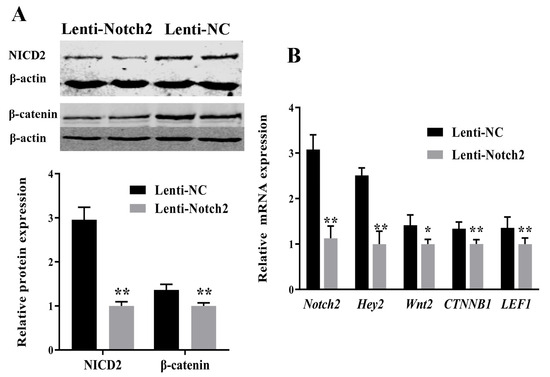 The Western blots showed that Notch2 siRNA significantly decreased NICD2 and β-catenin protein expression (Figure 6A, Figure S5). The RT-qPCR analysis showed that Notch2 siRNA downregulated Wnt2, CTNNB1, LEF1 (a Wnt target gene), Notch2, and Hey2 (a Notch target gene) (Figure 6B).