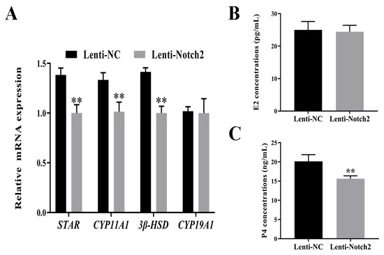 The ELISAs showed that Notch2 siRNA decreased the P4 concentrations in GCs (Figure 7B,C). The RT-qPCR analysis showed that Notch2 siRNA downregulated STAR, CYP11A1, and 3β-HSD, which was consistent with the steroid hormone concentration results (Figure 7A). The intra-assay CV for E2 and P4 was 8.29% and 8.08%, respectively, in the supernatant of GCs transduced with lenti-NC, and 7.59% and 4.24%, respectively, in the supernatant of GCs transduced with lenti-Notch2.