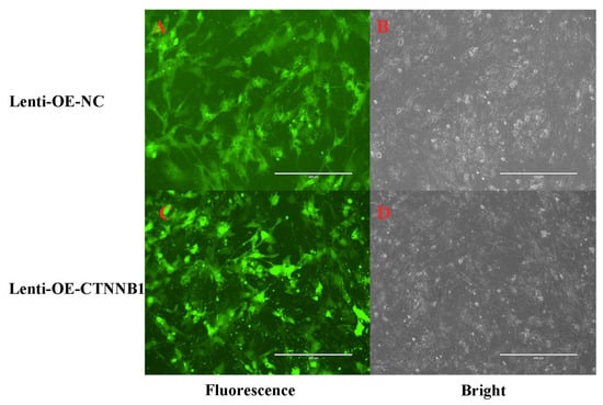 Bright-field and fluorescence images of bovine follicular granulosa cells (GCs) transduced with a negative control lentivirus (A,B) or a lentivirus overexpressing CTNNB1 (C,D) (100×).