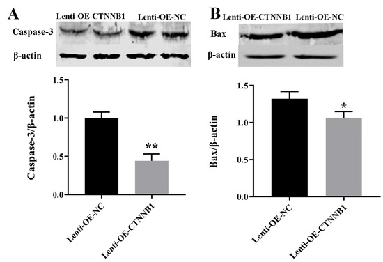 Effect of CTNNB1 overexpression on the expression of apoptotic proteins in bovine follicular granulosa cells (GCs). (A) Caspase-3 expression; (B) Bax expression. * p < 0.05, ** p < 0.01.