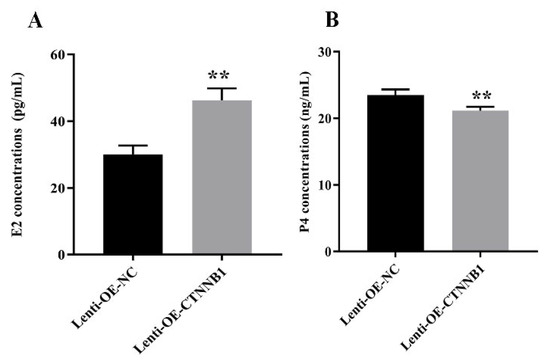Effect of CTNNB1 overexpression on steroid hormone concentrations in the supernatant of bovine follicular granulosa cells (GCs). (A,B) Concentrations of 17β-estrogen (E2) and progesterone (P4) in the cell supernatant. ** p < 0.01.