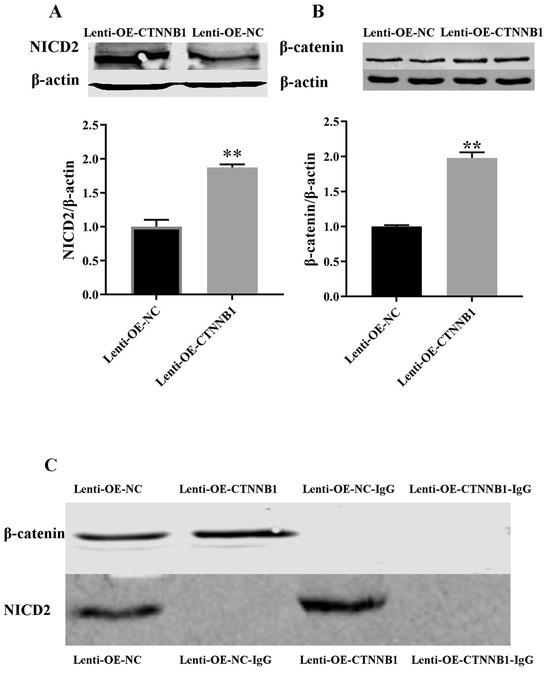 Interaction between β-catenin and Notch2 in bovine follicular granulosa cells (GCs). (A,B) Effect of CTNNB1 overexpression on NICD2 and β-catenin protein expression in GCs; (C) protein expression of β-catenin and NICD2 in protein complexes. ** p < 0.01.