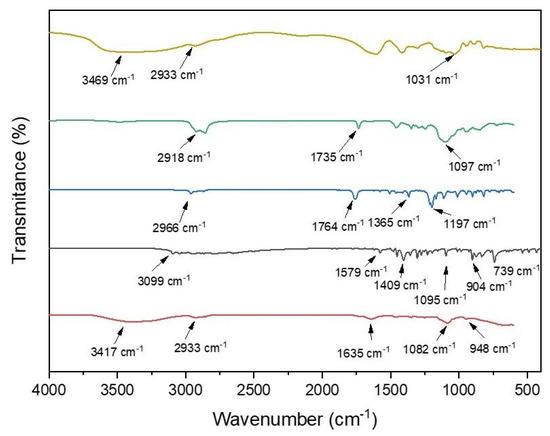 Fournier transform infrared spectroscopy (FTIR) spectra of sodium alginate, Tween 80, carvacryl acetate, thiabendazole, and emulsion with polymer matrix. Yellow line—sodium alginate; Green line—Tween; Blue line—carvacryl acetate; Gray line—thiabendazole; Red line—combination of carvacryl acetate, thiabendazole and sodium alginate.