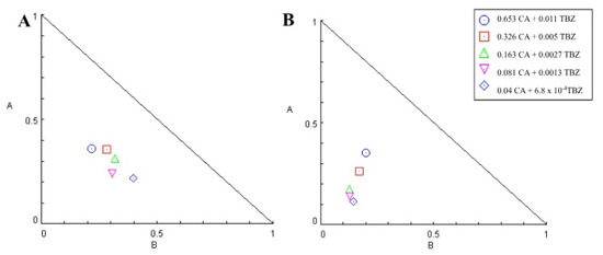 Isobologram of levamisole and carvacryl acetate combination without (A) and with matrix (B) on Haemonchus contortus in larval development test. Axes A and B correspond to carvacryl acetate and levamisole doses, respectively.