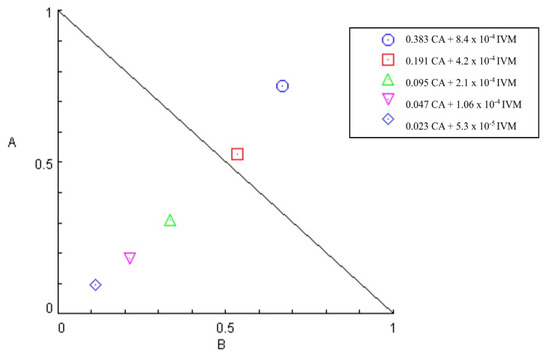 CA/IVM had a mean CI of 0.75, and the SR was 2.1. However, at the two highest concentrations, the CI was greater than 1, demonstrating antagonism (Table 6). The isobologram formed is shown in Figure 5.