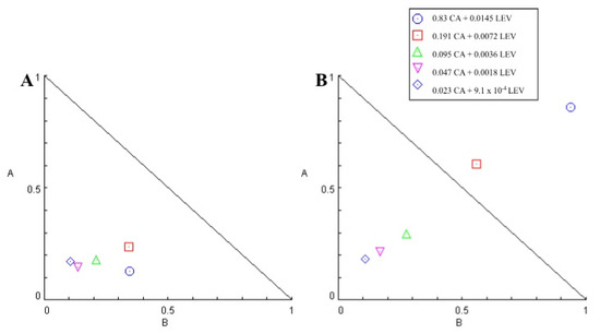 CA/LEV and CA/LEV/ALG had a dose-dependent effect. CA/LEV had a mean CI of 0.4, and CA/LEV/ALG had a mean CI of 0.93. CA/LEV had an SR of 5.51, and CA/LEV/ALG had an SR of 1.34. In all analyzed concentrations of CA/LEV, the CI was less than 1, demonstrating synergism between the compounds, and in CA/LEV/ALG, at the highest concentration, CI was > 1.5 and showed high antagonism (Table 7). The isobolograms formed by combinations without (A) and with a matrix (B) are shown in Figure 6.