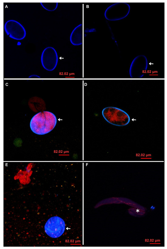 Confocal laser scanning microscopy images of Haemonchus contortus eggs: (A) Tween 3%; (B) 1% sodium alginate; (C) thiabendazole (0.05 mg/mL); (D) carvacryl acetate (8 mg/mL); (E) combination of thiabendazole and carvacryl acetate without matrix; and (F) combination of thiabendazole and carvacryl acetate with sodium alginate matrix (40× magnification). White arrows indicate an eggshell with or without larva, and asterisk shows a larva that is not fully developed.