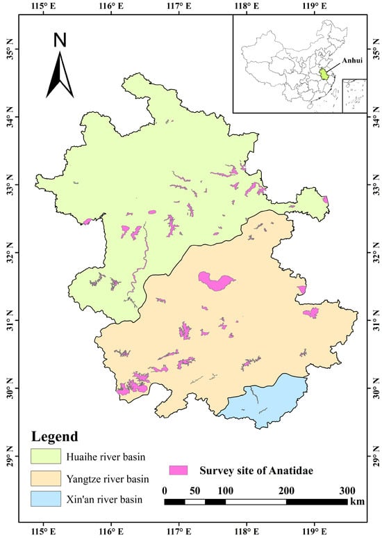 Anhui Province has a total area of 140,100 km2. The study area included various wetlands in the Yangtze, Xin’an, and Huaihe River basins in the province. These three rivers form multi-floodplain wetlands in this region. Most of the significant lakes and wetlands in Anhui are situated in the floodplains along the Yangtze and Huaihe Rivers, and the wetlands located in this area serve as crucial wintering ground for Anatidae. Additionally, many small reservoirs and ponds found between the Yangtze and Huaihe Rivers play a significant role as waterfowl habitats. The Xin’an River basin, located in the mountains of southern Anhui, primarily consists of riverine wetlands and valley-type reservoirs. The multiple river basins and unique landscape have created rich wetland resources and diversified wetland types in Anhui Province. Annually, over 200,000 waterbirds along the East Asian-Australasian Flyway choose to winter here [].