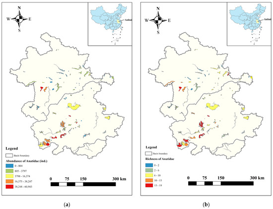 Distribution of abundance and richness of Anatidae in Anhui Province. (a) Abundance, (b) Richness.