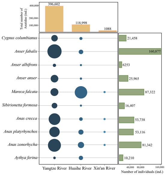 Number and distribution of top ten Anatidae species in the Yangtze, Huaihe, and Xin’an River floodplains.