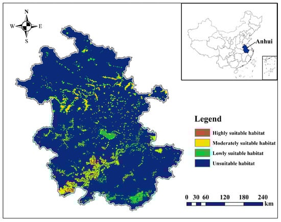 This study aimed to assess Anatidae habitat suitability in Anhui Province, predict their potential distribution, and gain insights into their habitat selection preferences in the region. The anticipated outcomes seek to offer a scientific foundation for Anatidae protection and management. Furthermore, this study aimed to broaden the scope of Anatidae research application, offer basic information on the spatial distribution of host animals for the early warning of epidemics, and contribute to the protection of biodiversity and maintenance of public health and safety [].