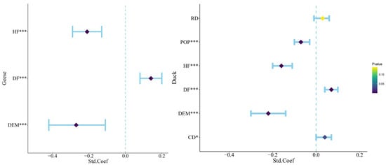 The GLMMs for geese and ducks each generated 64 candidate models. All explanatory variables included in the model analysis with the sum of Akaike weights > 0.5. All candidate models were ranked using ΔAICc (Difference between Candidate and Most Parsimonious Model), and the candidate models with ΔAICc < 2 are listed in Table 1. Based on the most parsimonious model, the GLMM showed a significant correlation between geese species richness and human footprint (HF), DEM, and distribution of farmland (DF). Meanwhile, duck species richness had significant correlations with distribution of the population (POP), DEM, distance from the countryside (CD), human footprint (HF), and distribution of farmland (DF) (Figure 5).