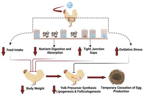 Coccidiosis rarely occurs in laying hens because of previous infection and the resulting immunity [10]. However, pullets reared in cages/on floors with coccidiostat drugs might not have enough exposure to coccidia to stimulate immunity. Outbreaks can occur after moving to layer facilities, either conventional cages or alternative housing systems [5,8,10]. Coccidiosis in laying hens has been reported during the early egg production period, around 23–24 weeks of age, and is characterized by high morbidity and mortality with a dramatic reduction in egg production [4,10,57,58,59]. Temporary cessation of egg production has been observed in laying hens infected with E. maxima, E. acervulina, and E. tenella. Hegde and Reid (1969) [57] reported that total egg production dropped to less than 20% when susceptible laying hens were independently challenged with different Eimeria species (E. acervulina, E. maxima, E. brunetti, E. necatrix, or E. tenella), with a significant drop observed two weeks post-challenge. It took 4–6 weeks to recover from infection, which varied among species. The mortality was more significant with E. necatrix and E. maxima following infection; however, the number of culled birds was not different from the control unchallenged group. Single-comb white leghorns infected with E. mitis experienced significant reductions in egg production and eggshell quality, undergoing complete molting before resuming egg production [58]. Hens recovered from coccidiosis may not reach their full egg-laying potential [60]. An outbreak of E. necatrix in a breeder hen facility resulted in significant mortality among breeder hens and roosters, as well as a 4.3% reduction in egg production following the recovery period compared with hens of the same age [59]. Recent studies in our lab have observed that coccidiosis at the pre-lay stage of growth delayed the onset of maturity and egg production by two weeks, and infection at peak egg production drastically dropped egg production and temporarily ceased egg production in some hens [34,36]. Reduced egg production during a coccidiosis outbreak might be because of the malabsorption of nutrients, including amino acids, carbohydrates, and minerals, which are essential during the laying period [6,7,8,61]. The possible mechanism of how coccidiosis affects the performance of laying hens is shown in Figure 1. Reduced feed intake and damage to intestinal linings following coccidiosis are evident. This damage caused by Eimeria to the intestinal tract affects the digestion and absorption of the nutrients required for egg formation [36]. Furthermore, it has been observed that plasma amino acids are lowered, and amino acid imbalance occurs during coccidiosis [55]. The limited availability of nutrients and amino acids in laying hens might reduce the synthesis of albumin, an important component of an egg, thus reducing egg production. Increased oxidative stress during coccidiosis might damage the developing oocytes and granulosa cells, leading to follicular atresia, production, and deposition of yolk precursors in selected ovaries, or occurrence of apoptosis in the oviducts and ovarian follicles [36,62,63]. These disruptions to normal physiological and reproductive functions might contribute to a decline in egg production. Additionally, the redistribution of energy during coccidiosis for tissue repair, inflammation, and maintaining oxidative status might also be responsible for the decline in egg production [36]. These studies showed that laying hens are susceptible to coccidiosis during the laying phase, with a dramatic reduction in egg production posing substantial challenges to the egg industry. The economic loss to the industry is mostly from reduced egg production, reduced feed intake, and an increased FCR due to malabsorption of nutrients and mortality.