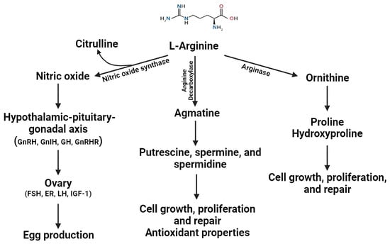 Effect of L-arginine and its metabolites on gut health and reproductive functions in laying hens. FSH: follicular-stimulating hormone; ER: estrogen; LH: luteinizing hormone; IGF: insulin-like growth factor 1.