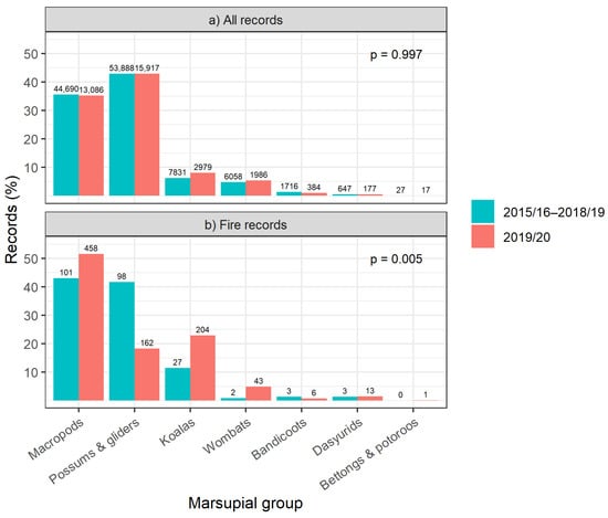 Marsupial group as a proportion (%) of (a) all marsupial records and (b) fire-affected marsupial records for the years 2015/16–2018/19 (blue columns; n = 125,439 for all records; n = 235 for fire records) and 2019/20 (red columns; n = 37,076 for all records; n = 889 for fire records). Record counts (n) are presented above columns for each taxonomic group.